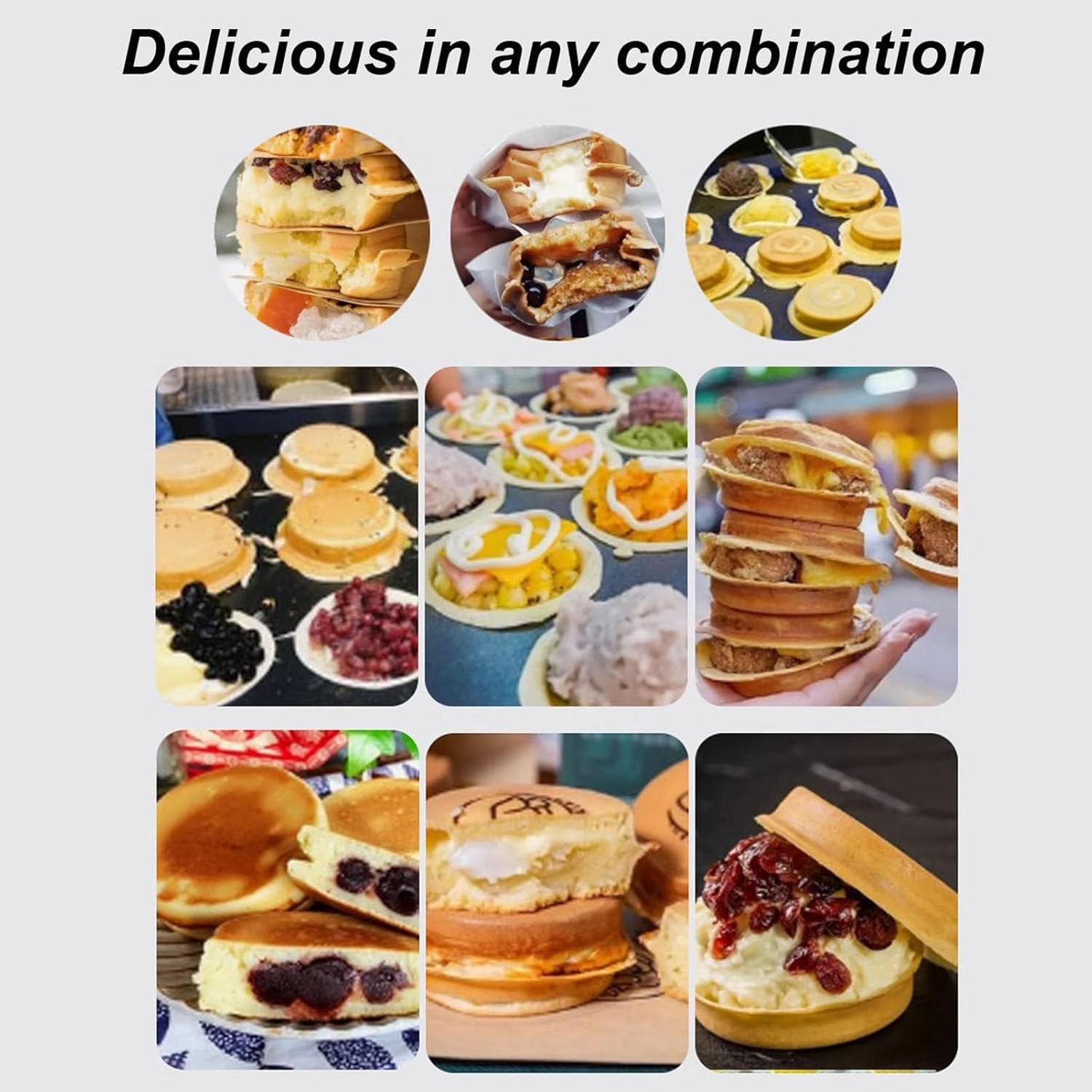 Do you want to have a fluffy, thick and delicious omelet in just minutes The omelette maker non-stick can even be used for desserts, mini cheesecakes custard, all within minutes. Our 18-cup omelet pan is not limited to breakfast foods. It can be used all year round to prepare tasty eggs and bacon. Its wide range of applications includessert shops, ice cream shops, juice shops, milk tea shops, bars, trams, bakeries, and more. Specification: Status: New Power: 2000W+2000W Capacity: 18pcs/time Temperature:50-300 ℃ Egg castle diameter: 8CM Size: 58X37X17CM Packing Weight: 8.5kg Package: 1 * Hamburger Pressing Tool