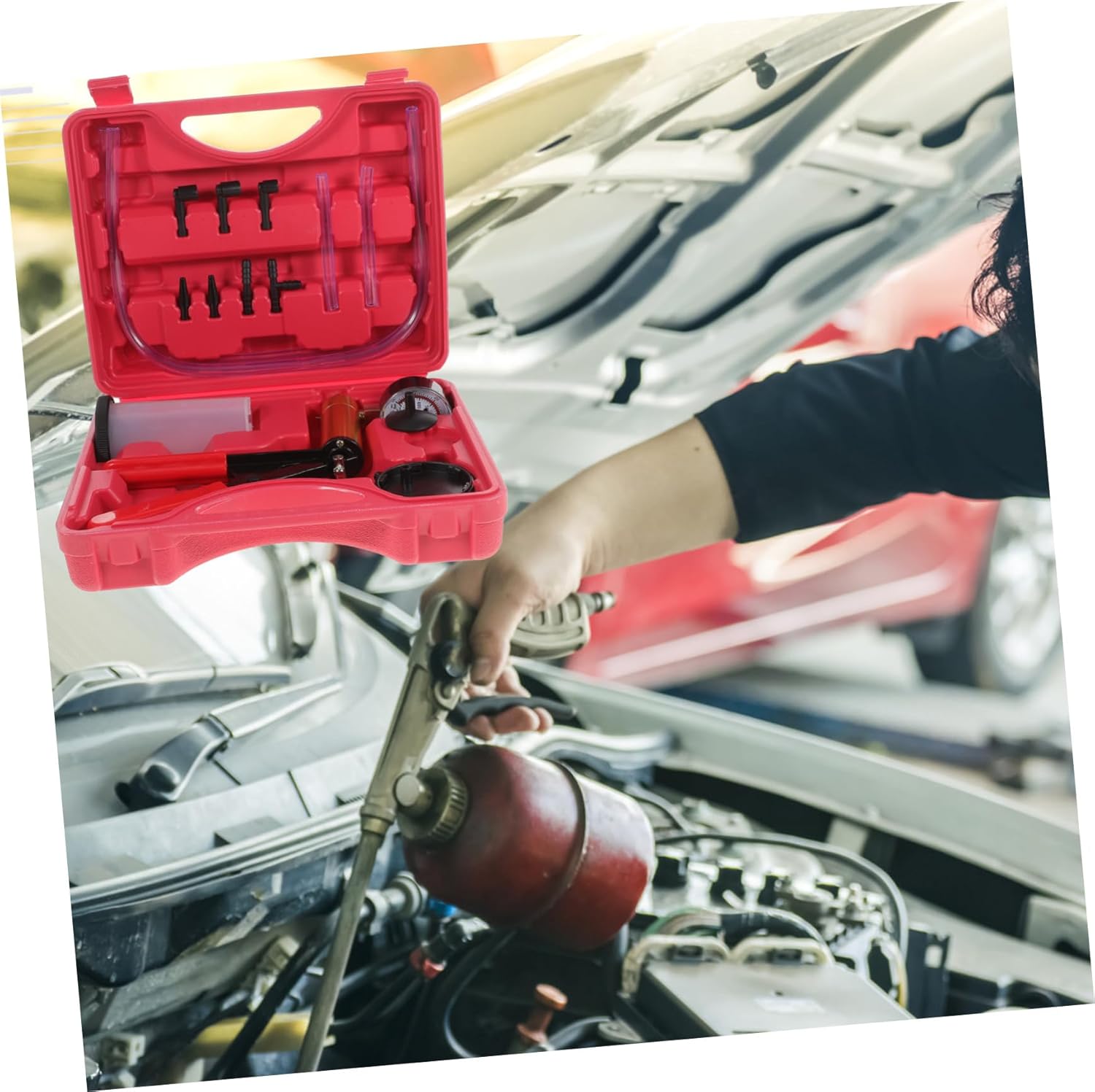 Package List 1 x manual vacuum pump 1 x measuring cup with lid 9 x adapters 2 x short transparent tubes 2 x long transparent tubes Characteristics -Material: ABS, rubber, aluminum alloy Vacuum Pump Test Tool. -Color: Assorted Brake Fluid Bleeder Tool. -Size: About 24.00X18.50X3.80cm/9.43X7.27X1.49in Brake Bleeder Kit. - The design of of different lengths meets the needs of most the models Brake Bleeder Tools. - The hose is designed with a release valves that produces a negative pressure Vacuum Pump Tuner Tool. - The product package has a complete range of products to meet the needs of auto parts maintenance Car Vacuum Pump Tool. - The sturdy handle is equipped with a brake fluid collector with a variety of connectors to meet different needs Manual Vacuum Kit. - Replaceable cylinder ring, rubber piston ring and valves Car Manual Vacuum Kit.Goods InformationCar Brake Bleeder Kit Comprehensive workshop vacuum pump kit includes reservoir and adapter for brake and fuel line bleeding.Car Manual Vacuum Kit The hand operated pump pulls the fluid through the bleed nipples, eliminating need to use the brake lever or pedal