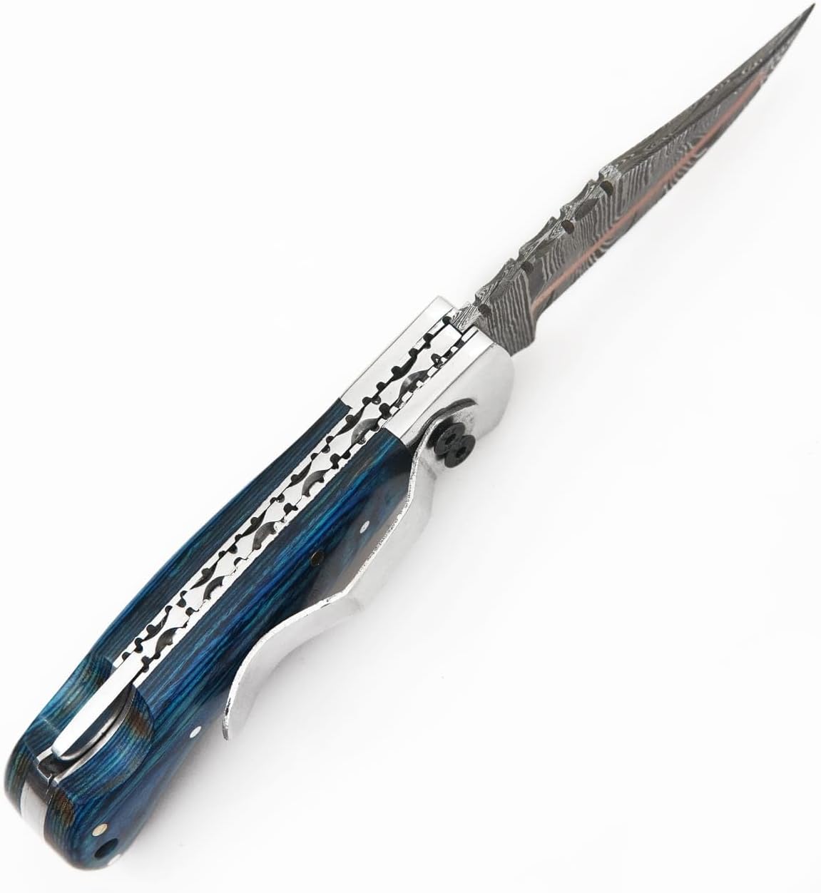 The FLARA EAGLE 6.5โ Handmade Damascus Copper Folding Knife is a must-have for outdoor enthusiasts, collectors, and EDC users. Featuring a razor-sharp Damascus steel blade, this knife delivers exceptional cutting performance, edge retention, and corrosion resistance. The copper and wood handle offers a striking aesthetic with a comfortable, non-slip grip for precise control. Perfect for camping, hunting, fishing, and survival situations, this compact pocket knife With Clip is easy to carry and comes with a leather sheath for added protection. Whether you're an outdoorsman, a tactical gear enthusiast, or looking for the best gift for men, this EDC folding knife is designed for reliability and versatility. ๐น Product Specifications: โ Brand: FLARA EAGLE โ Blade Material: Handmade Damascus Steel โ Handle Material: Blue Wood โ Total Length: 6.5 inches โ Weight: 160 Inches โ Locking Mechanism: Secure Folding Back Lock โ Includes: Premium Leather Sheath ๐น Why Choose the FLARA EAGLE Folding Pocket Knife? โ High-Performance Damascus Blade โ Sharp, durable, and stylish. โ Multi-Purpose Use โ A must-have for hunting, survival, camping, fishing, hiking, and self-defense. โ Elegant & Functional Handle โ Copper and wood design for both grip and aesthetics. โ Perfect Gift for Men & Knife Enthusiasts โ Ideal for collectors, outdoor lovers, and adventurers. โ Safe & Convenient Carry โ Folds securely and comes with a durable sheath.