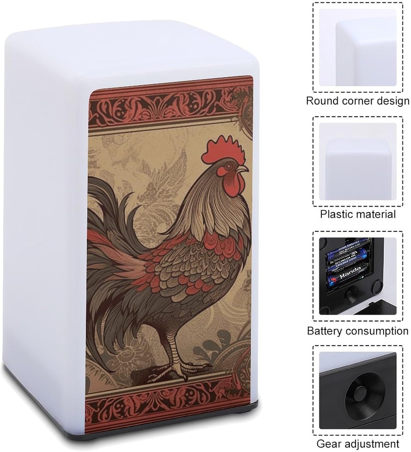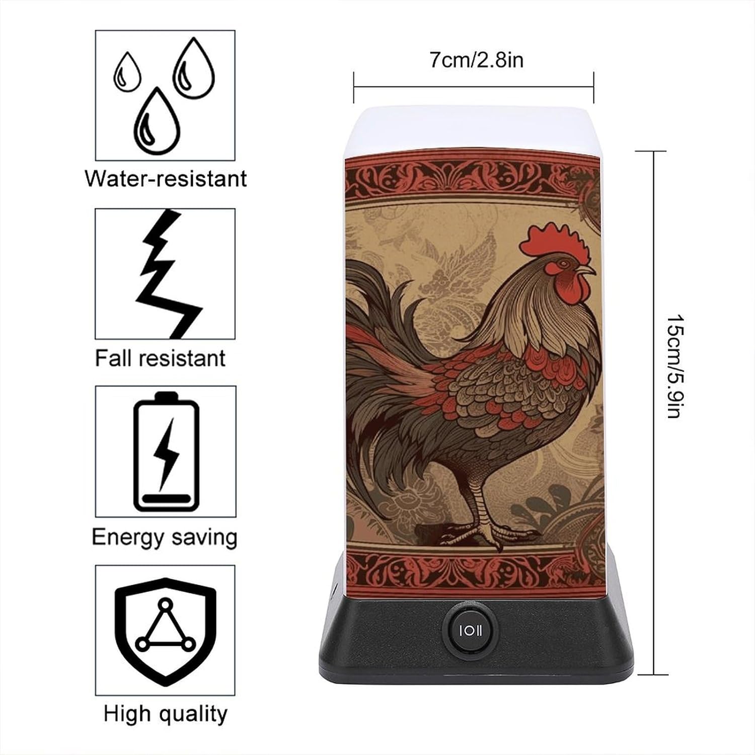 With a strong, impact-resistant plastic construction, this Old Rooster Illustration printed small bedside table is durable enough to withstand accidental knocks and splashes, making it an ideal lighting companion for bathrooms, kitchens and more. The carefully designed rounded edges ensure safety and fit in any homeThis cordless lamp is ultra-portable, meaning it won't take up much space on your desk or bedside table. And it's battery-powered so you can get light wherever you need it - in the bathroom, hallway, or even outdoors (note: not rechargeable)It easily adjusts the brightness to suit any activity, so it's versatile! In the bedroom, it's a bedside lamp, where the soft light helps you fall asleep easily without the harsh light. In bars and lounges, it creates a warm and inviting atmosphereThis mini lamp combines classic style with modern functionality, making it an ideal gift for friends, family or colleagues. This thoughtful gift is sure to surprise them with a sense of style, practicality and convenience