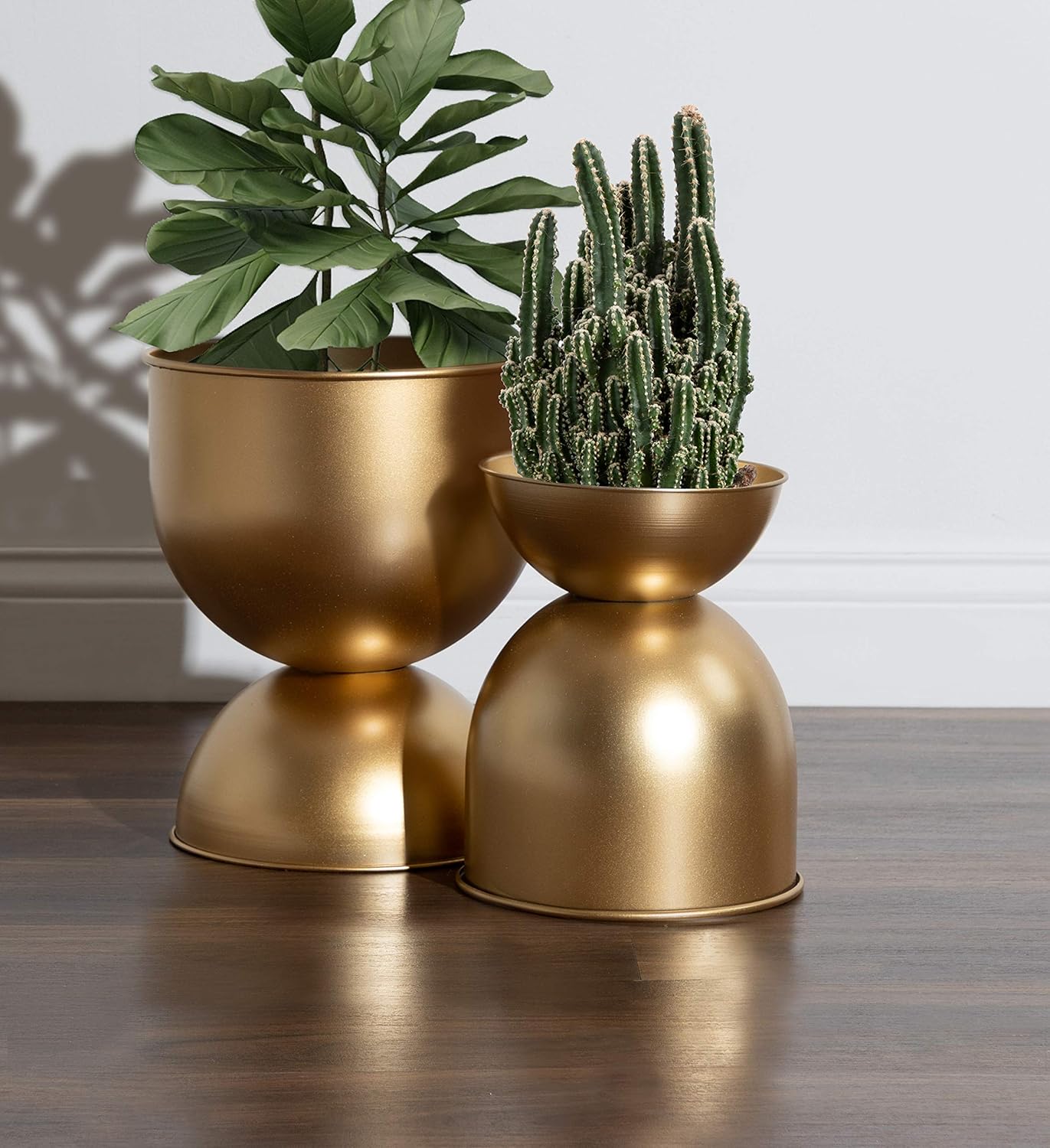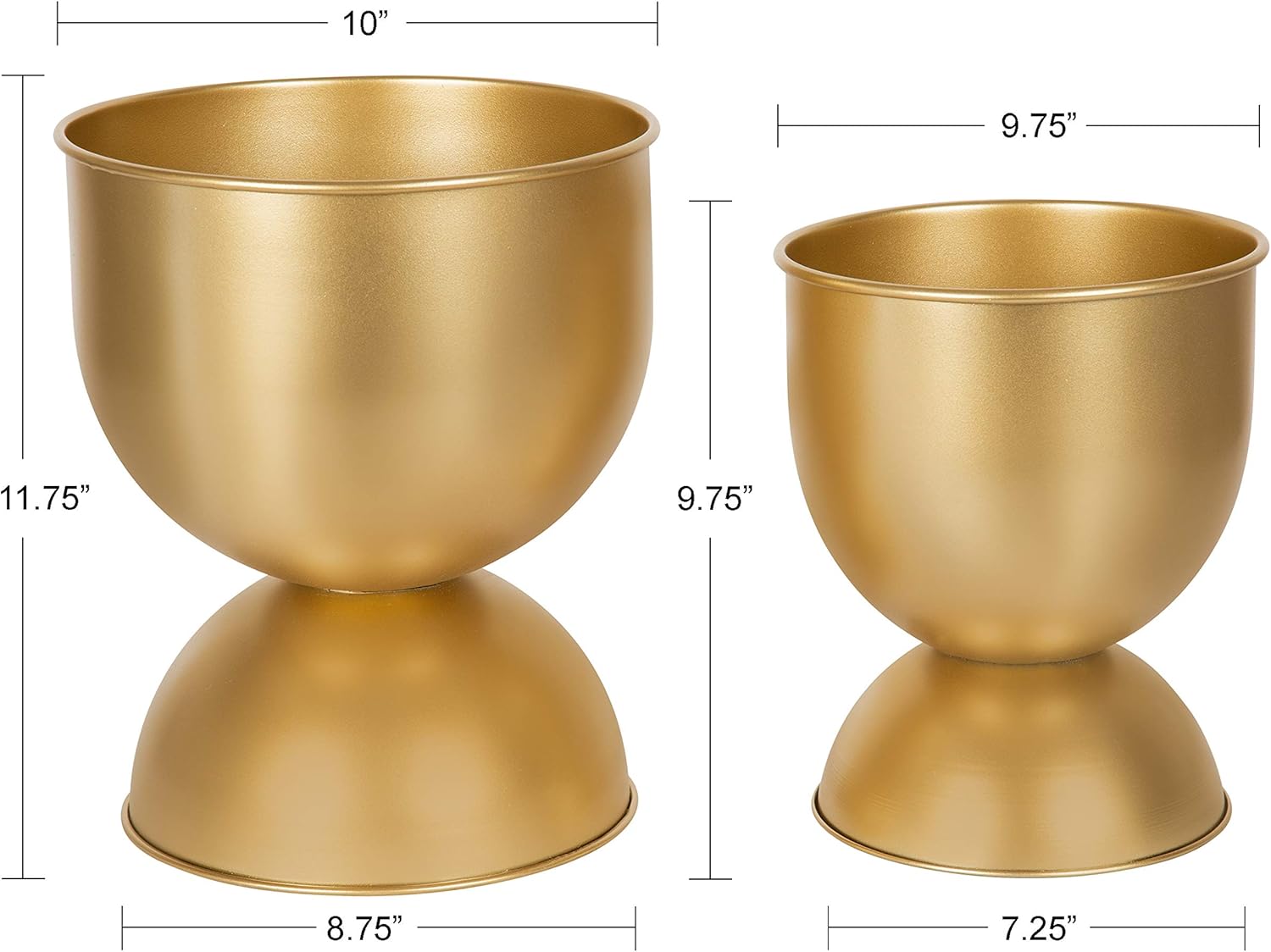Create a decorative centerpiece or luxurious table accent with the Volz planter set from Kate and Laurel. Design for the modern decorator, the Volz planters feature an eye-catching, chalice-like design with two basin-like shapes on the top and bottom. These planters were made from a 100% metal, giving them a robust look that is as resilient as it is glamorous. The gold finish also draws the eye, captivating your visitors and leaving them raving. This set of planters features two distinct sizes: the larger Volz planter has a 10 inch diameter, while the smaller planter has an 8 inch diameter. They're great for showcasing your favorite faux plants, or if you have a durable liner you can use them to grow your own greenery! The small size of the Volz planters make them great as functional catch-alls for items such as jewelry, keys, wallets, and other household accessories. Decorate your home with a beautiful piece of greenery that will delight your guests and make you into the plant parent of your dreams.