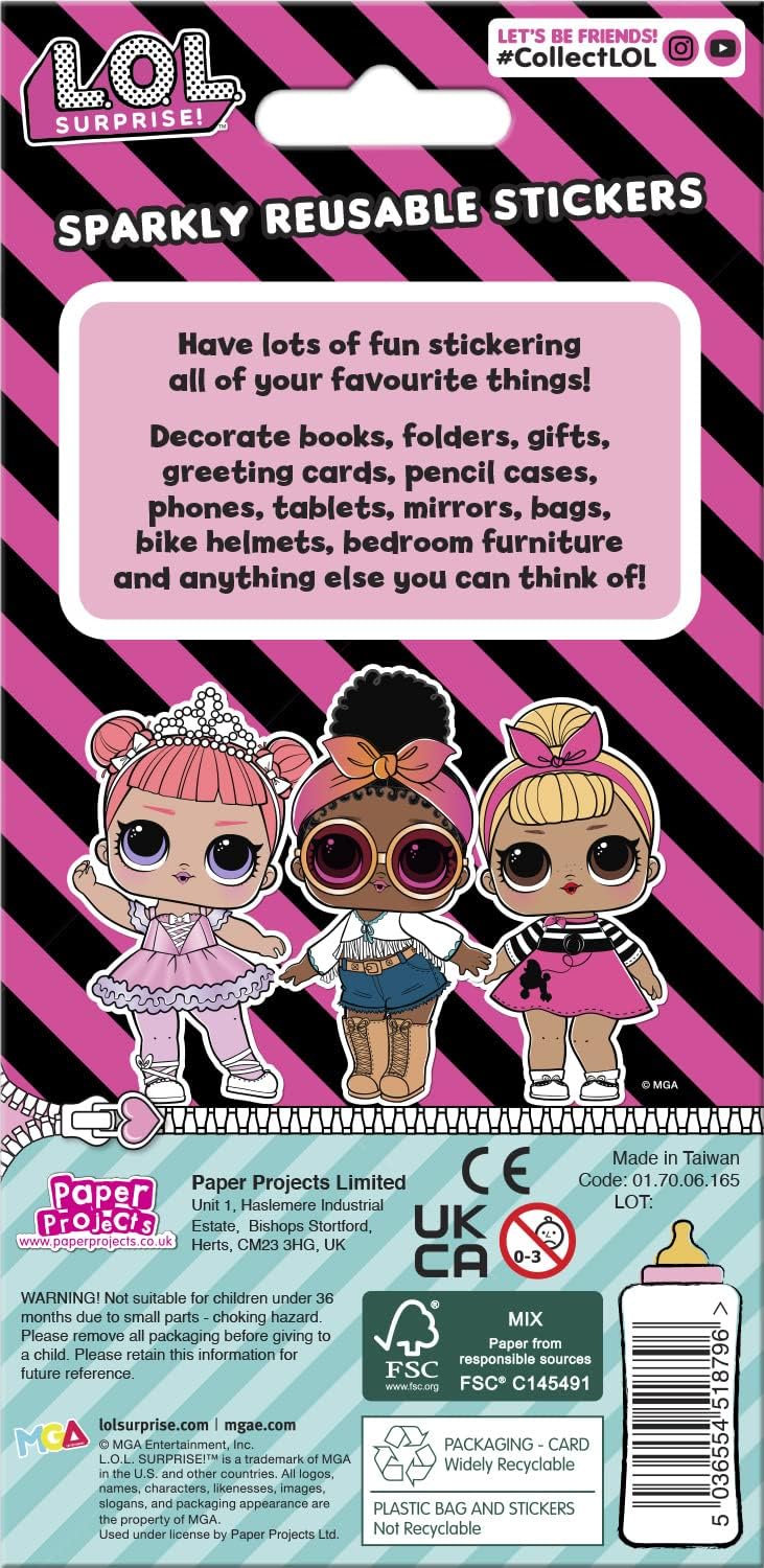 L.O.L. Present Surprise! Sparkly Stickers, by Paper Projects. Official licensed product that includes one sheet of sparkly reusable reward stickers featuring lots of wonderful L.O.L. dolls, and a colourful backing card. Our stickers can be used for decoration, craft work, as a stocking or party bag filler, as a reward badge, or anything else you can think of! They are also easily removable from non-porous surfaces, should the need arise.Paper Projects stickers are always a hit with children of all ages – because as we all know, kids love stickers!