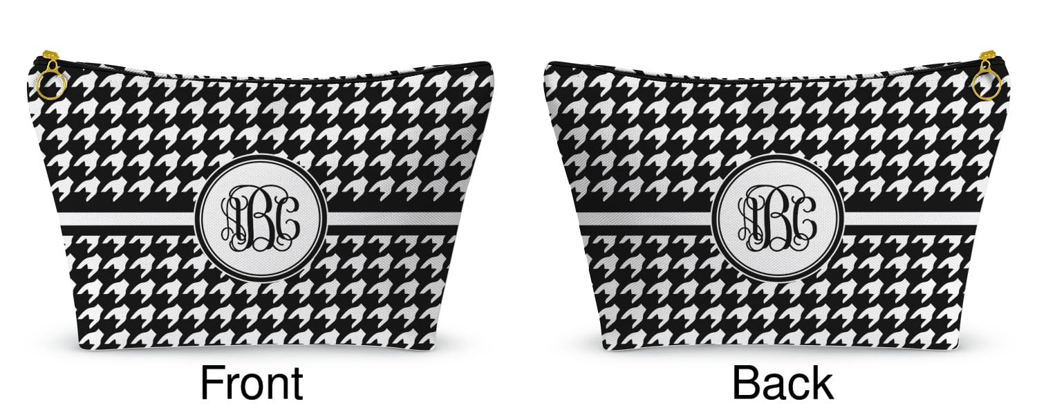 Most women I know wear makeup and end up carrying some cosmetics in their purse and a lot more when they travel! So if you are like most women, then why not carry your cosmetics in makeup bags that reflect your personal style? These makeup bags are also perfect for gift giving.Our bags are made from soft & durable canvas; have a black fused lining and have a gusset (see photo of side view) on the bottom so you can fit a lot of items in the bag. Our makeup bags are offered in 2 size - the small is approximately 8.5W x 4.5H x 2D and is perfect for your purse or to carry jewelry when you travel. The big one is approximately 12.5W x 7H x 2.5D and is perfect for all your makeup.Browse our cosmetic bags and see if there is one you like. Start there and customize to your liking; you can change as little as just the colors and the personalization or you can browse our customization system for additional template styles, backgrounds, labels, ribbon & personalization styles. Create something that truly reflects your personality. Design Shown: Houndstooth (#67619)Features:==================================== * [Two Sizes Available]: Small (8.5W x 4.5H x 2D) for your purse or jewelry, Large (12.5W x 7H x 2.5D) for all makeup. * [Durable Canvas Material]: Soft, sturdy canvas with a black fused lining ensures long-lasting use. * [Gusseted Bottom]: Extra space on the bottom allows for more items to be stored comfortably. * [Double-Sided Customization]: Choose unique designs for the front and back, reflecting your style.Care Instructions:==================================== * Machine Washable: On a gentle cycle with mild detergent and cold water * Recommended: Turn bag inside out ideally place in mesh laundry bag * Do not use bleach or fabric softener * Air dry or tumble dry on low