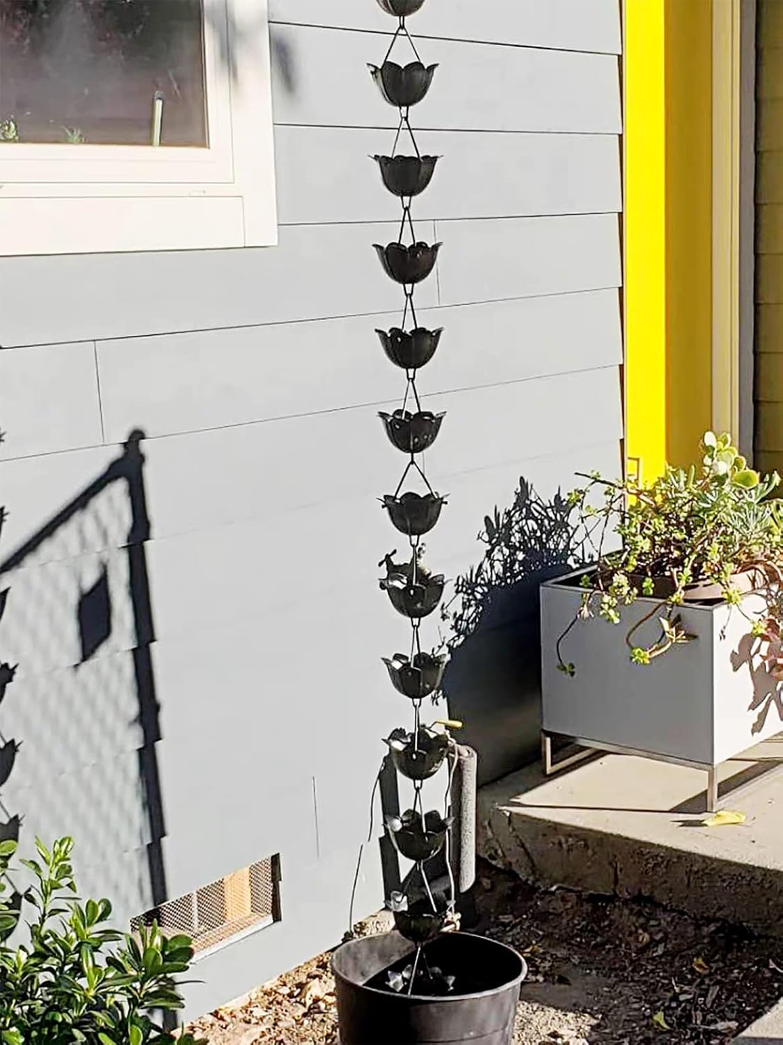 This rain chain directs rainwater from the roof to the ground and is both functional and aesthetically pleasing. Specification Material: aluminium Cup Size: width x height Length: can be customized Cup Numbers: can be customized Features Sturdy and durable. Adjustable rain chain length. Both functional and decorative. For long-time outdoor use. Simple and quick installation. Can effectively direct the flow of rainwater. Cautions Please clean the gutter before installation. There may be an error of due to manual measurement. Due to light problems, there will be a small color difference, subject to the real thing. Each cup of the outdoor rain chain is designed with a wide upper and a lower narrow, effectively capturing most of the rainwater, but some splashes will occur.
