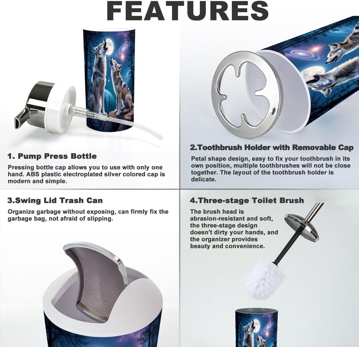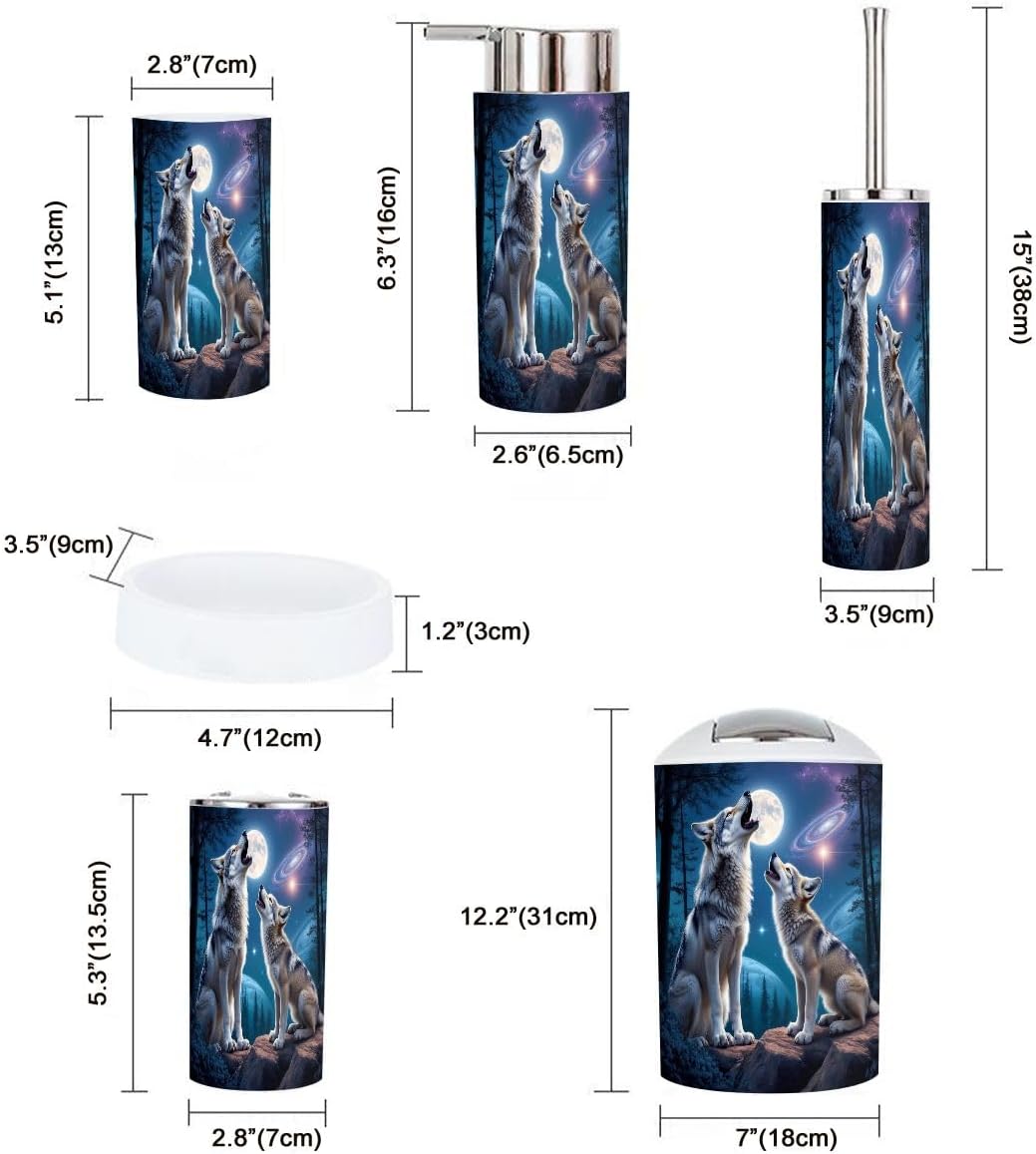 Bathroom Accessories Set 6 Pcs Rustic Wolf Puppy Night Sky Stars Trees Moon Earth Bathroom Decor Toothbrush Holder Cup Soap Dispenser Soap Dish Toilet Brush Holder Trash Can for Countertop Decor