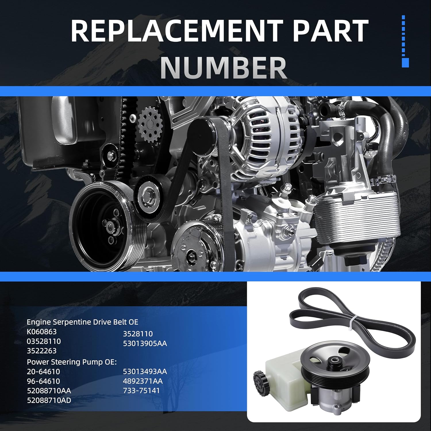 • Replacement Part Number: Power Steering Pump replaces for 20-64610, 96-64610, 52088710AA, 52088710AD, 53013493AA, 4892371AA, 733-75141;Engine Serpentine Drive Belt replaces for K060863, 03528110, 3522263, 3528110, 53013905AA